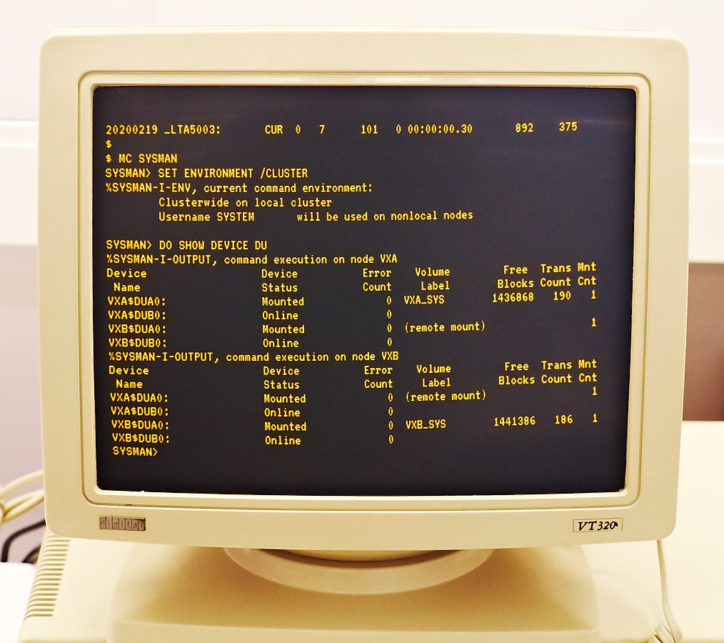 We can see that node VXA has disk VXA$DUA0 mounted and node VXB has disk VXB$DUA0 mounted, but all other disks are not mounted yet on any node.