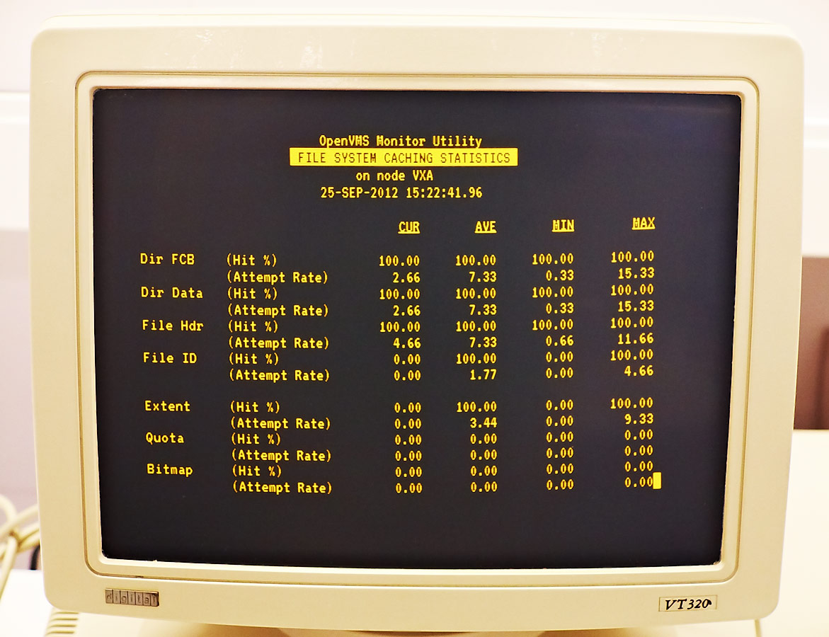 We can see that test program does indeed bypass data cache since extent cache attempt rate is very low. Cache hit rate and ratio can also be displayed with DCL command SHOW MEMORY /FULL /CACHE.